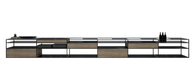 With its elegant appearance and rhythmic shelves Jest, can be used both in private and corporate spaces. The metal structure that forms the body is combined with marble, glass and veneer shelves to become a multipurpose storage unit. Due to flexibility in the array, the TV unit can vary as sideboard and/or storage units