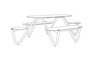 The fully galvanized steel structure that can be stacked during transport, carries seats and a tabletop made of aluminium sheet or high-pressure laminate (HPL).