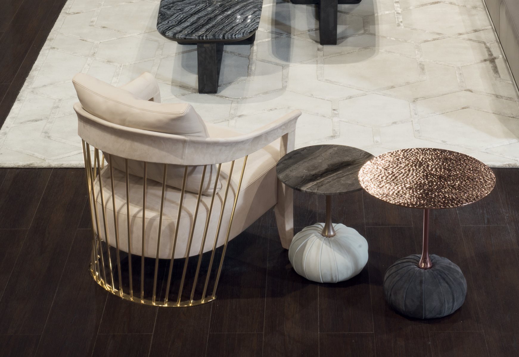 The metal backrest of the armchair is made with a laser-cut frame and by metal pipes assembled individually with a handmade procedure, and chrome plated in the finishes: Satin nickel, bright shaded brown, Black Rose gold, bright light gold, matt Champagne gold, bright chrome, bright black chrome, matt satin bronze, bright pink gold, matt pink gold.