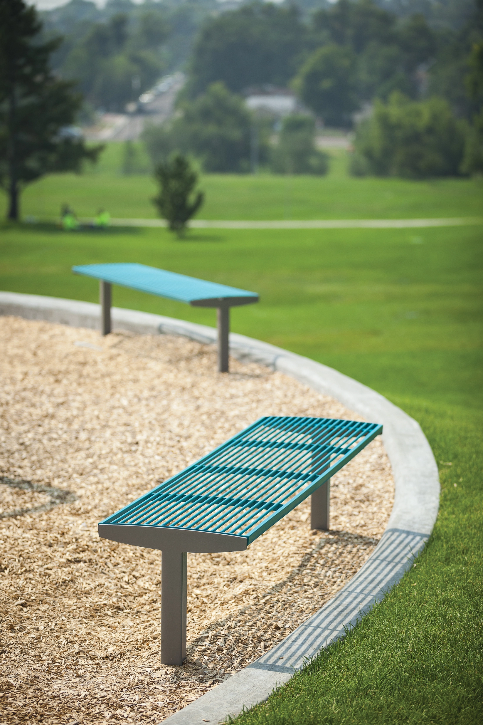 Galvanized steel structure treated with powder coating. Seat and backrest made of wooden boards or slats; or with steel or stainless steel rounds. Available with armrests. Anchored below the ground, or wall-mounted.