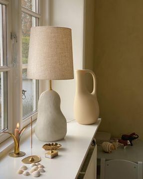 Made of ceramic, this medium-sized base has a matte, coarse, and light finish, offering any room a rough, yet calm look. Combine it with one of the matching textile lampshades of the series.