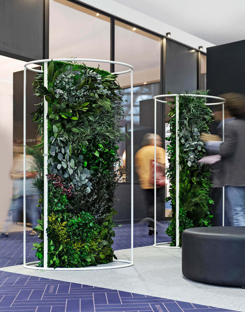 The G-Divider is a moss-covered panel contained within an oval-shaped metal frame. It’s designed to act as a space divider and is ideal for placement in large interior spaces such as open-plan offices, reception areas, conference rooms, and event halls