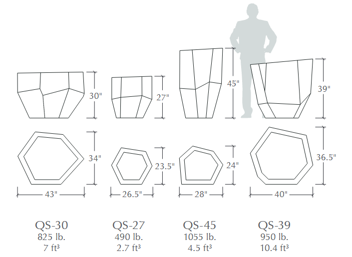 Dynamic intersecting planes inspired by the crystalline structure of quartz minerals resonate deeply with both modern architecture and the natural world. Quartz Series precast concrete planters are available in four sizes, ranging from 27” to 45” in height and 26.5” to 43” in diameter.