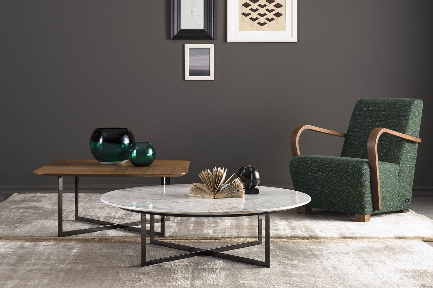To suit any home decor, the cross legs and top can be customised in a range of finishes and colours. The base comes in Black Nickel or Brushed Bronze metal, while the top is available in a selection of prized marbles or Canaletto Walnut. Noteworthy, the wooden coffee table features a sophisticated decorative pattern of alternating horizontal and vertical grain.