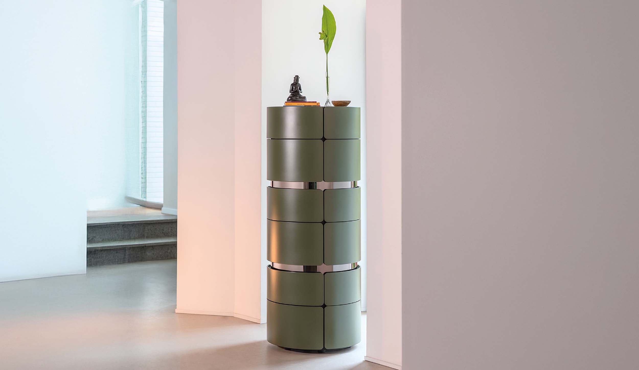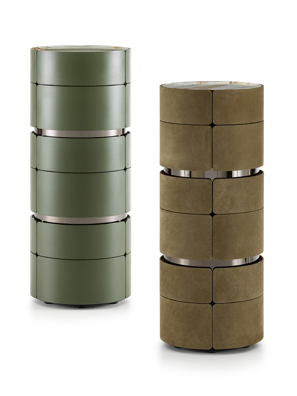The distinctive feature of all the elements are the polished metal rings (finishes: gold, black nickel or chrome) set into the surface and alternating with the drawers, creating an effect of depth and visual lightness.