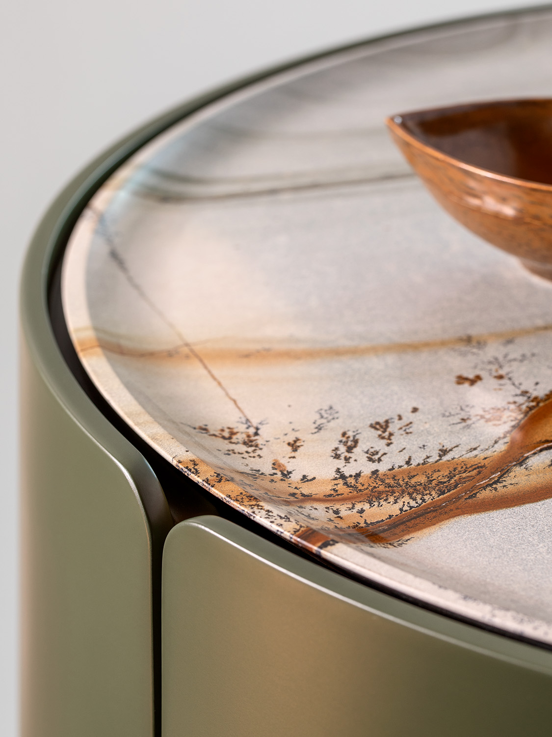 The use of high-quality materials for the covering and the top, the absence of handles and the contrasting finishes enhance the purity and simplicity of the design. A slight flare of the top facilitates the containment of objects.