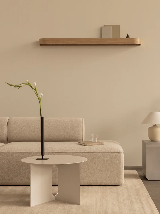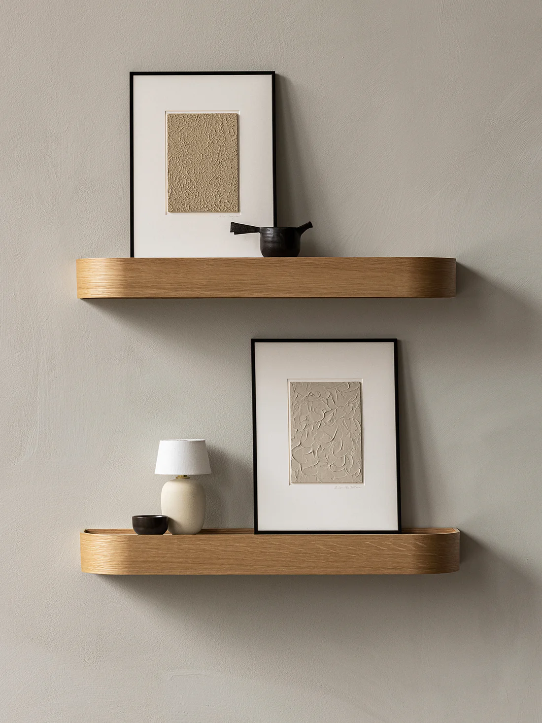 The Epoch Shelf is crafted in wood veneer and offered in two natural finishes: natural or dark stained oak.
