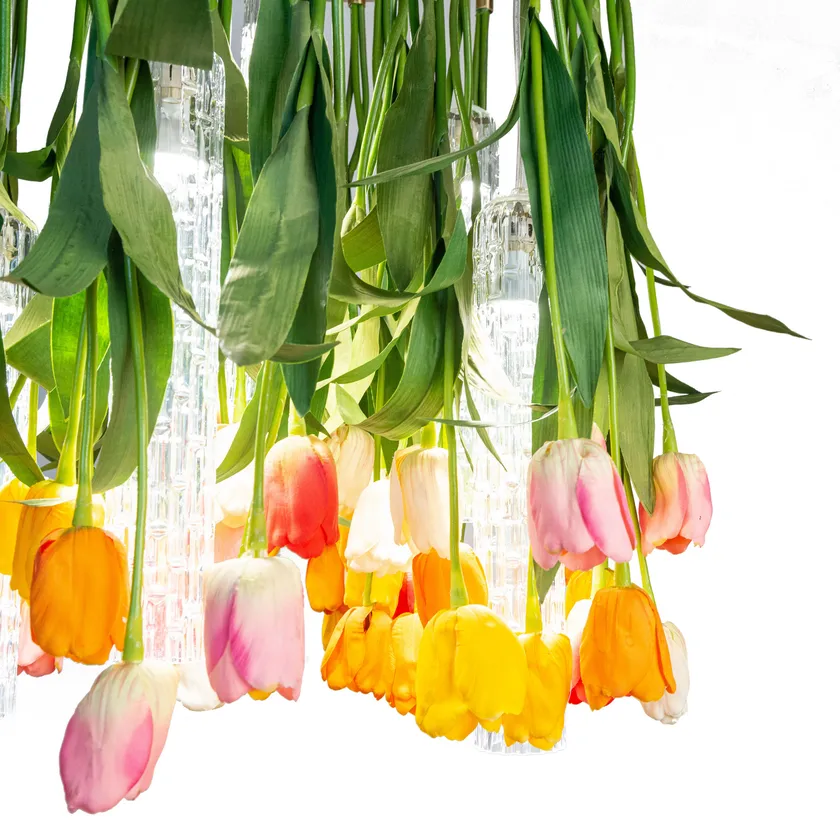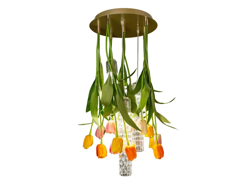 A chandelier whose lymph is imagination, the same one that turned the assumption of verticality upside down, roots in the air and stems down, letting leaves and flowers gracefully fall, entwined with exquisite Murano glass. The first Flower Power is born as an ode to Spring, to the awakening of nature, with the decisive and at the same time delicate shades of Tulips.