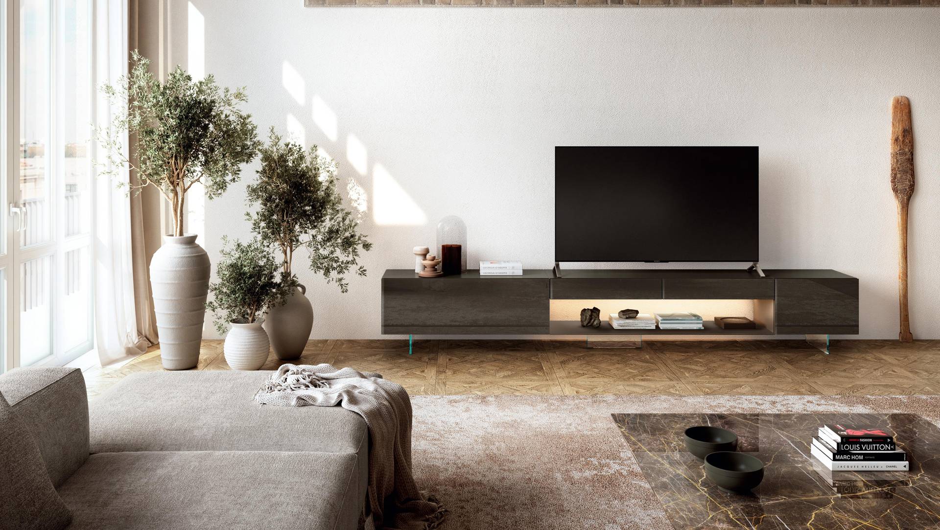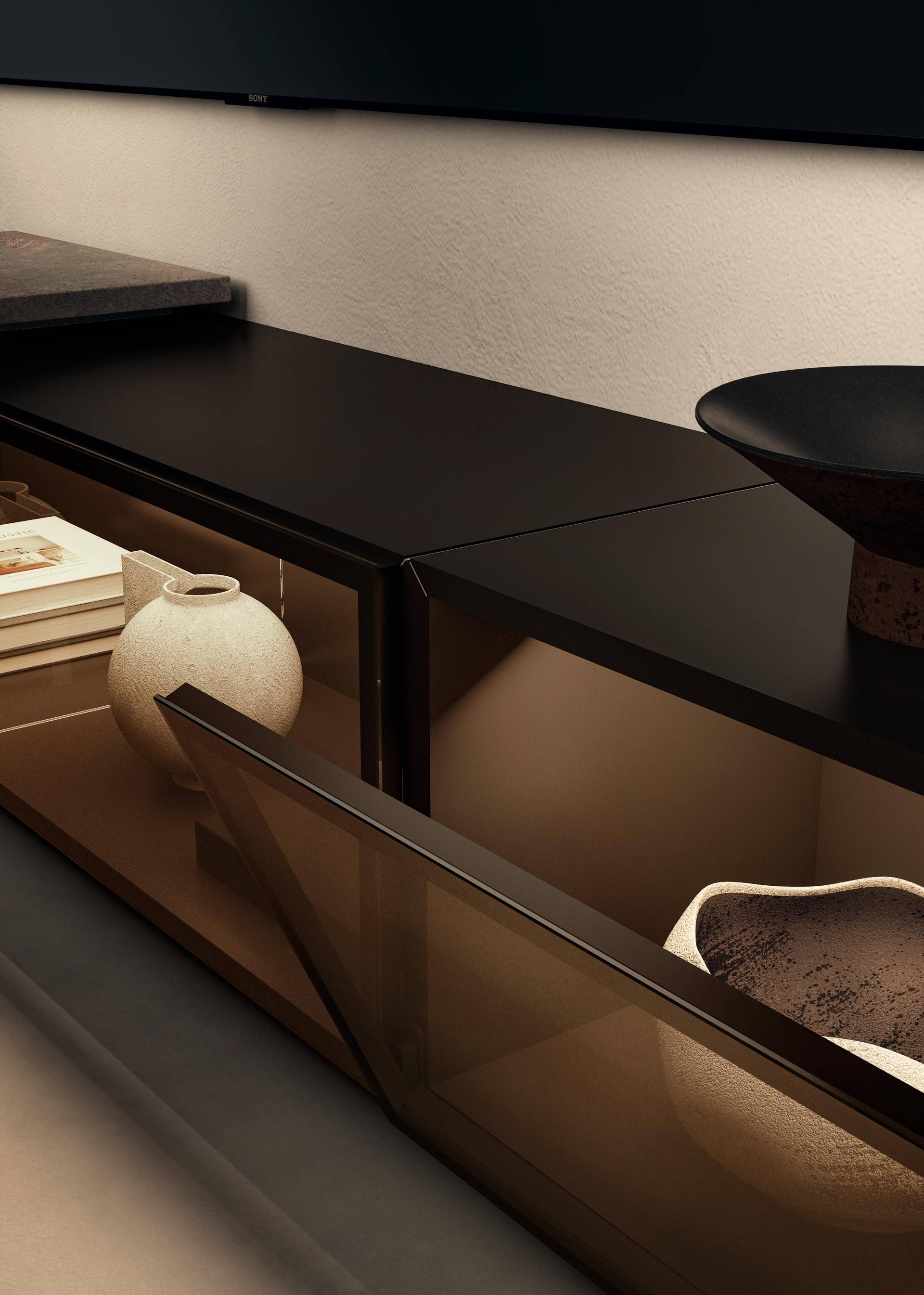 The display cabinets, perfect volumes with attention to the smallest details, complete the design of the TV furniture, further enriching its design possibilities. A lacquered aluminum profile, like the structure, elegantly resolves the continuity of finish with the storage elements, equipped with opening mechanisms and an integrated lighting system. Each element combines smoothly and naturally, resulting in TV furniture that meets space and design requirements.