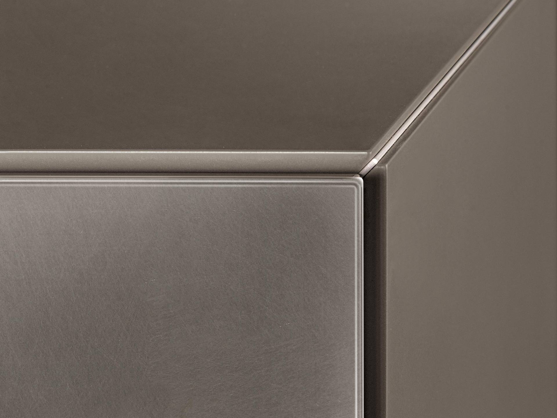 Metal XGlass surfaces boast vivid, iridescent reflections, achieved by applying five layers of lacquer, which are then hand-brushed to finish, giving the surface a dynamic sense of movement.