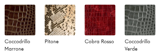 The striking skins of snakes and crocodiles cover the monolithic and formally perfect glass surfaces of LAGO products.