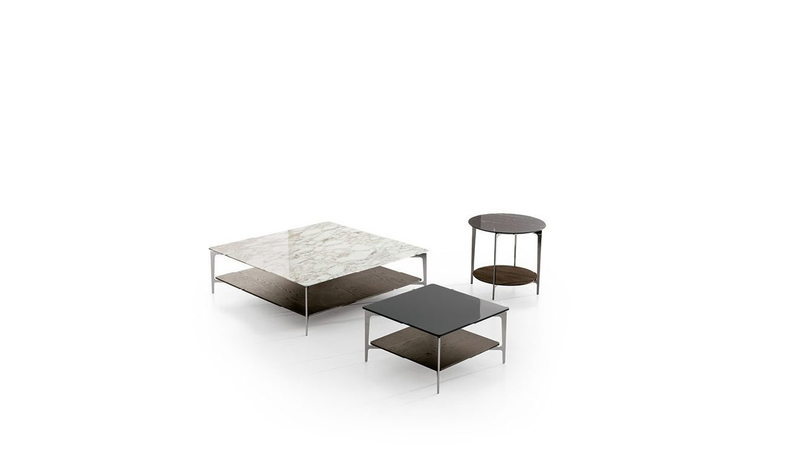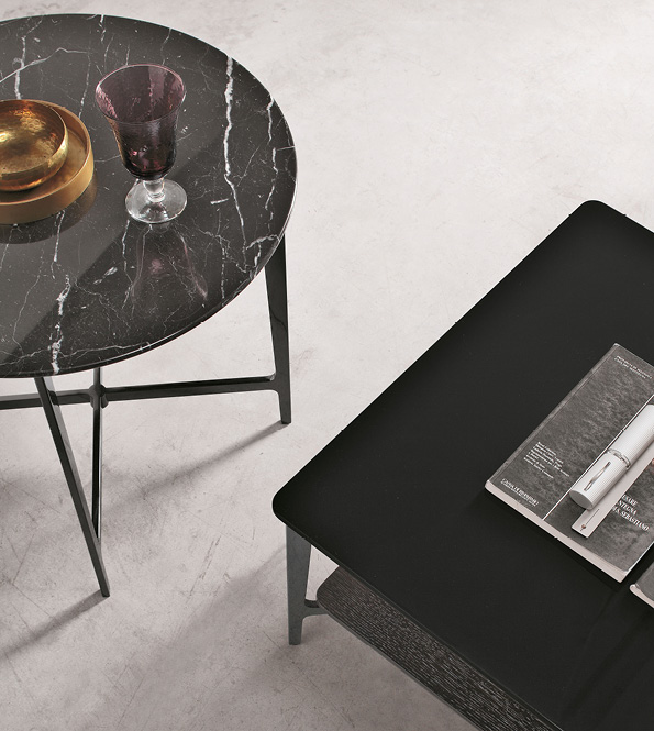 A collection of occasional tables supported by an elegant steel base that contrasts with the colours of the top: heat-treated wood, marble and customized lacquered surfaces. Versatile solutions for the living room or bedroom.
