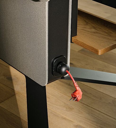 The sturdy frame, covered on both sides with optional sound-absorbent fleece, conceals the mount for the power supply, mini PC, and power cable. The Display Rack’s clear design blends in seamlessly with a range of settings.