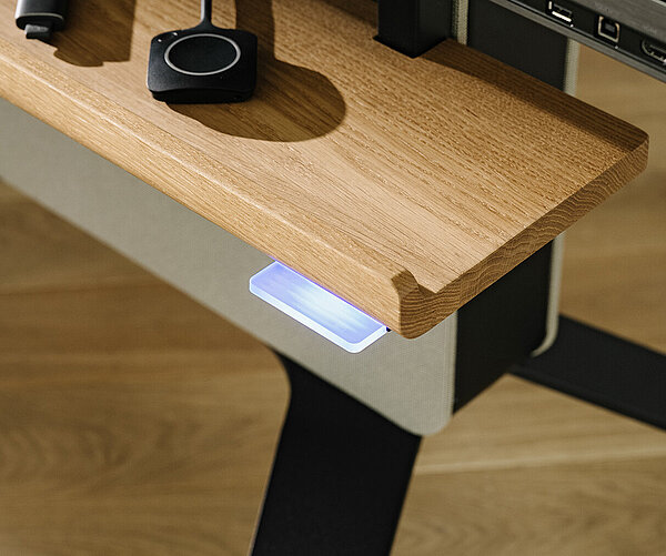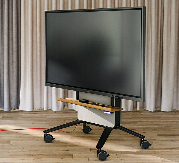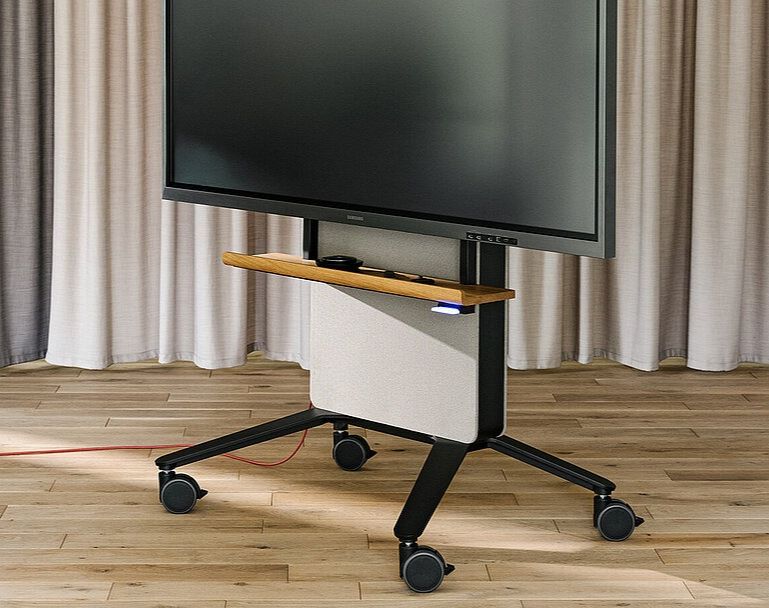 The Display Rack positions an up to 85-inch screen weighing 85 kg max. right where it’s needed. In boardrooms, training spaces or lounges, the mobile monitor stand with a VESA mounting pattern is ideal for presentations, video conferences and other types of teamwork in large groups. The module and shelf for soundbars and multimedia components can be at sitting or standing height thanks to electrical height adjustment of up to 65 cm.