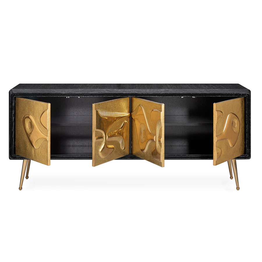 Divine details—a slight bevel on the solid oak casing, a nifty float between the oak and the brass cabinet, and fab touch-latch closing mechanisms take our Reform Credenza to the absolute height of couture craftsmanship.