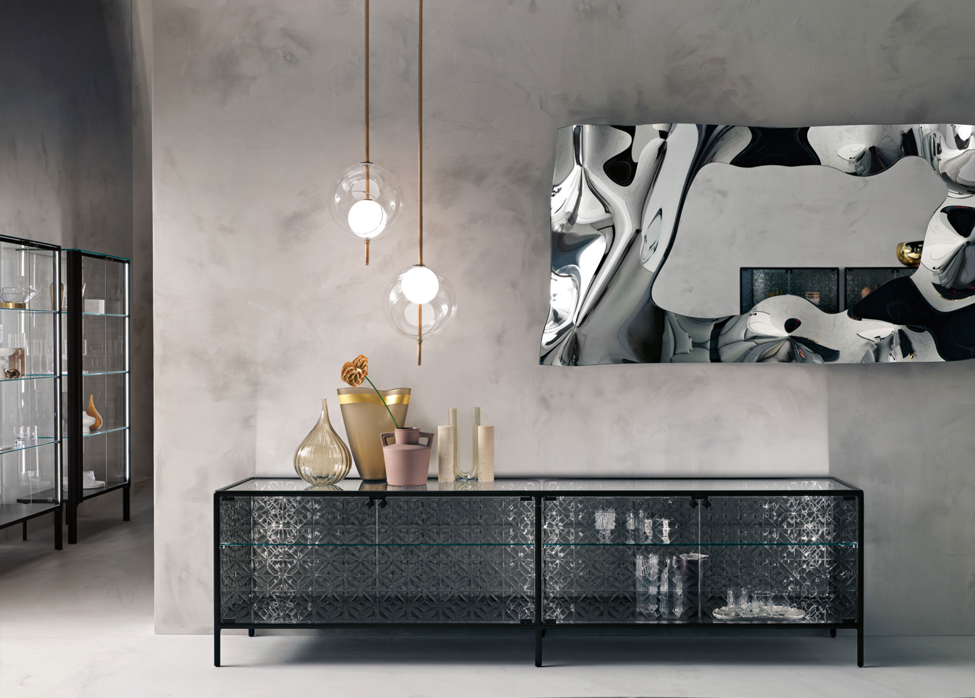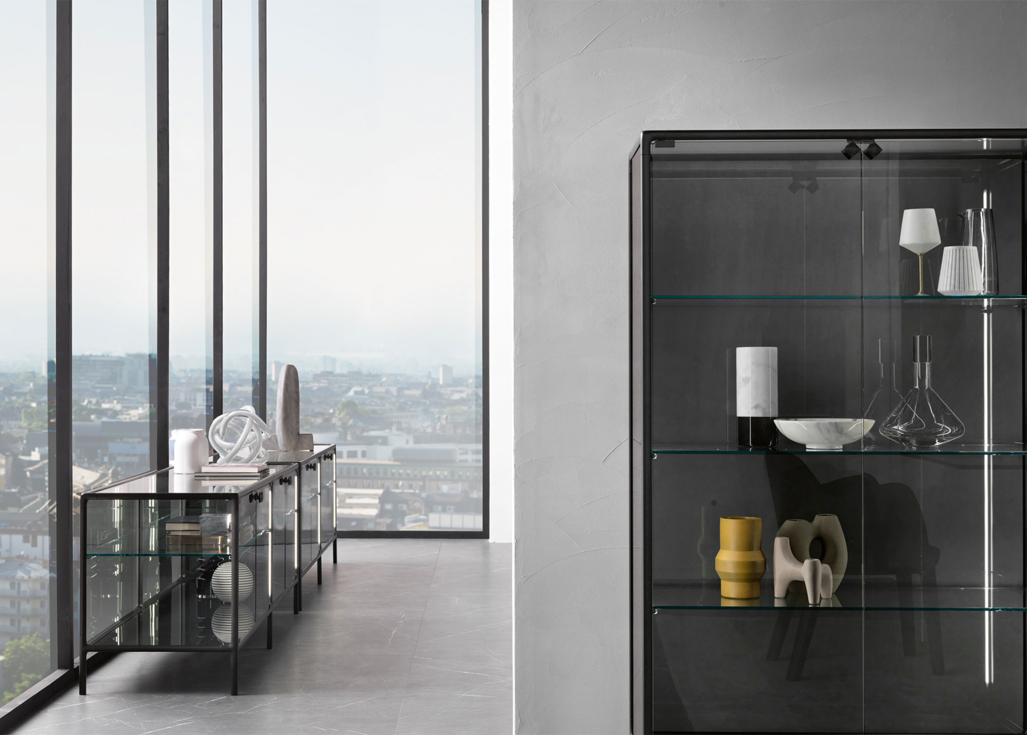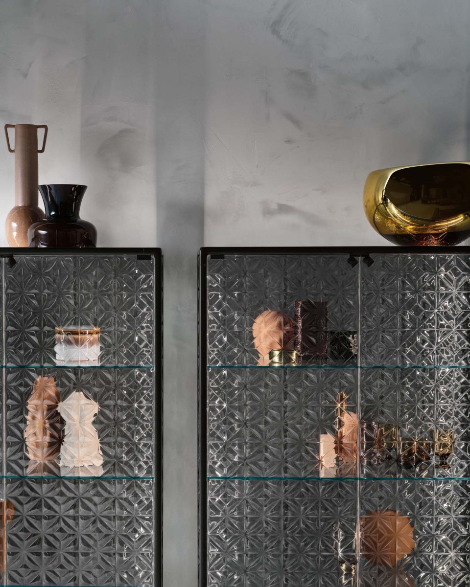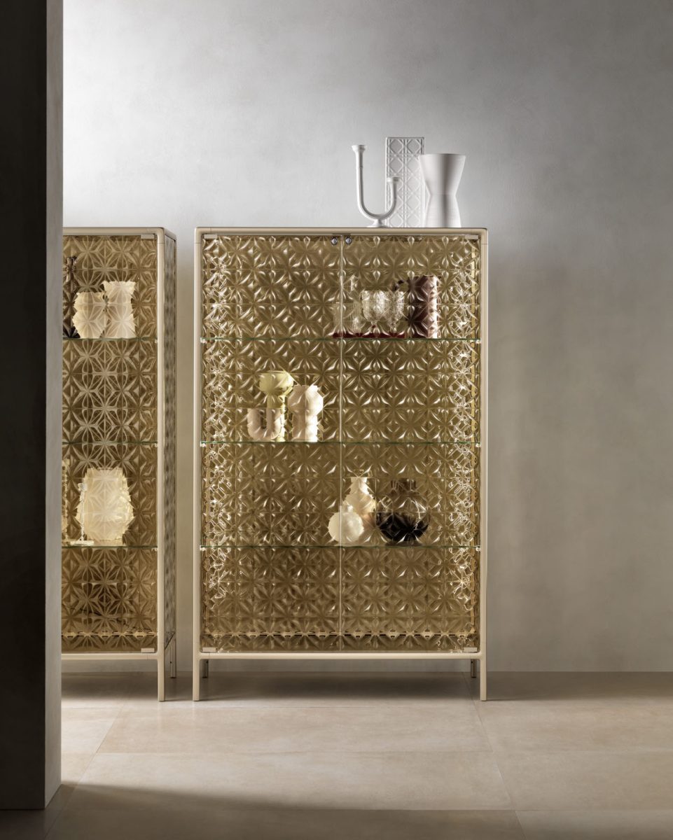 Base in 6 mm extralight tempered glass, back-painted to match the frame; display cabinet body and doors in 6 mm extralight, smoked, or bronze fused and tempered glass; shelves in 8 mm extralight tempered glass.