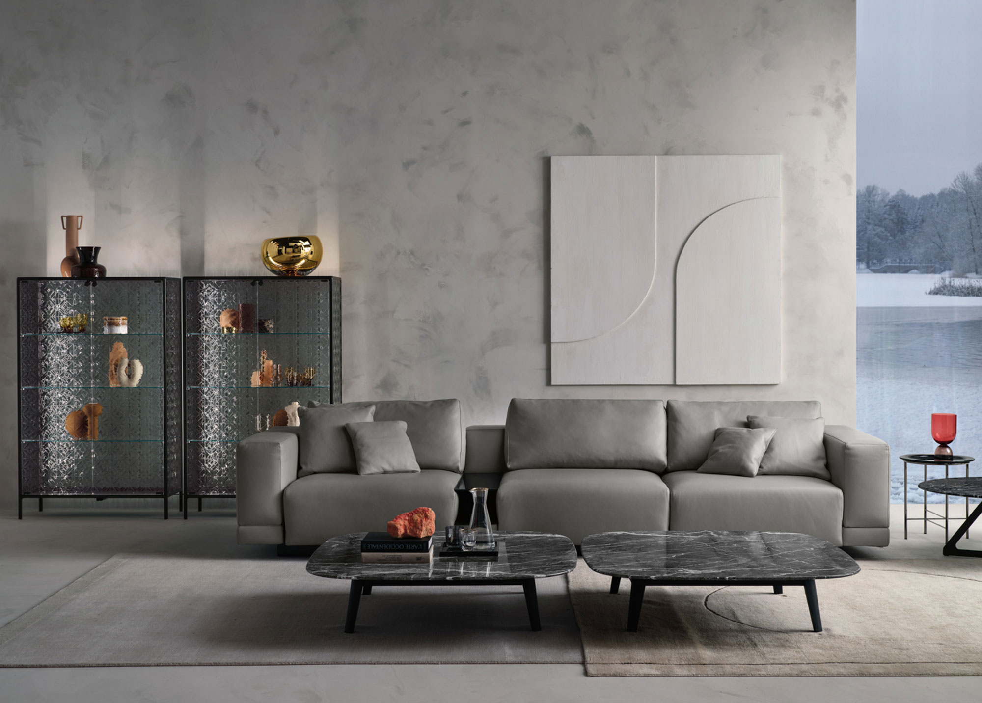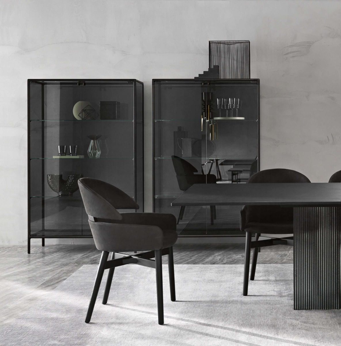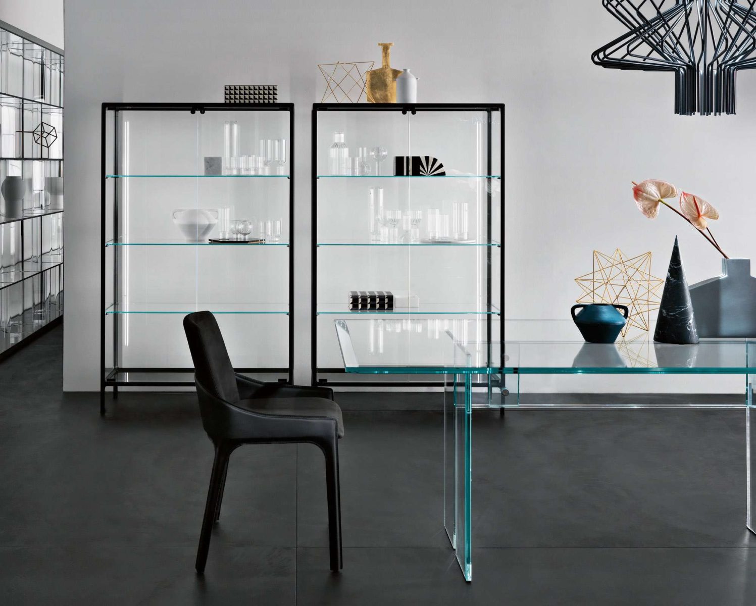 Base in 6 mm extralight tempered glass, back-painted to match the frame; display cabinet body and doors in 6 mm extralight, smoked, or bronze fused and tempered glass; shelves in 8 mm extralight tempered glass.