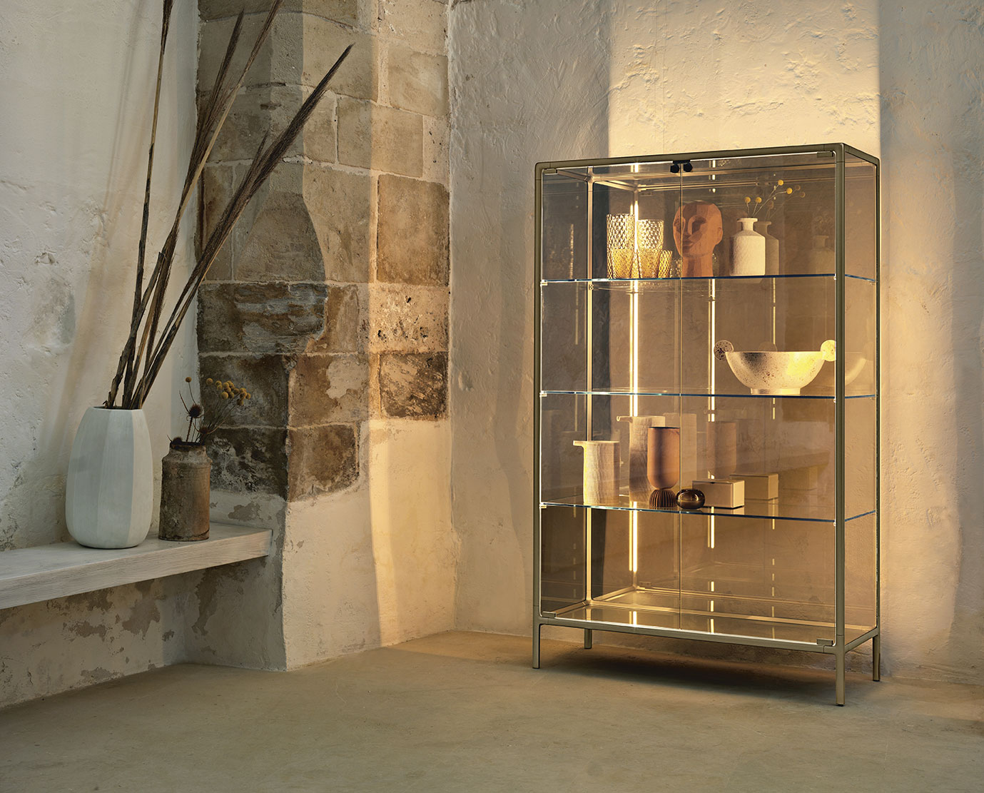 Display cabinet with painted aluminum frame, available in metallic champagne and volcano grey finishes.